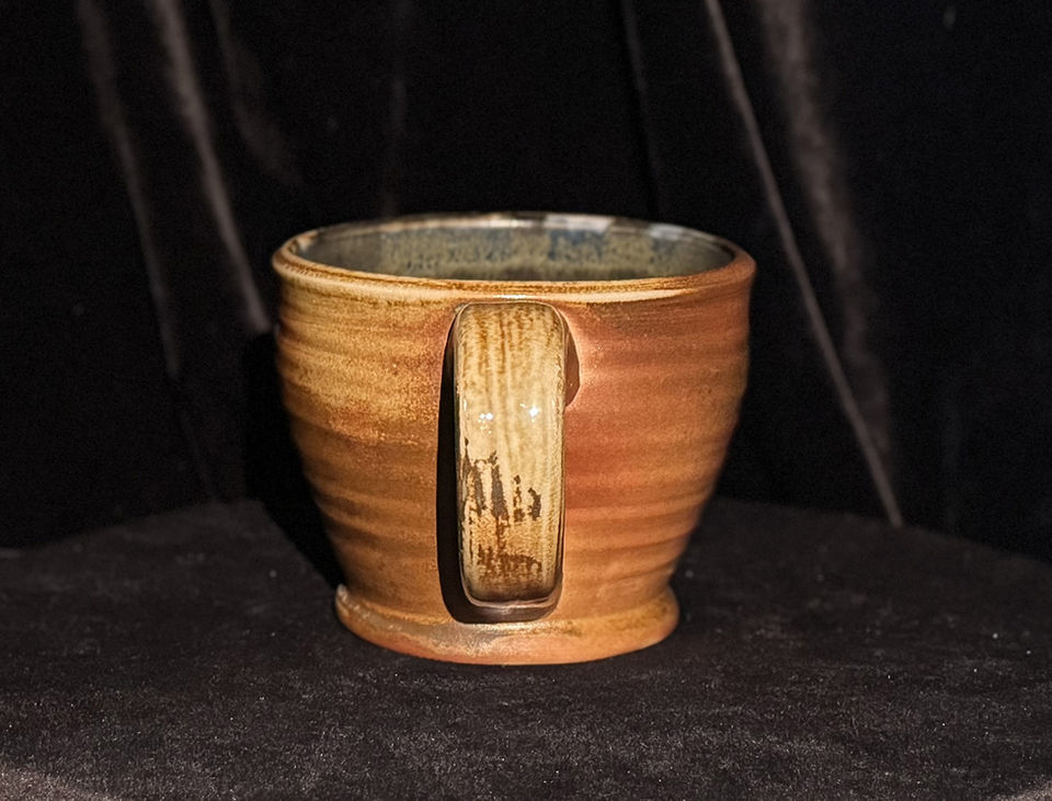 Another popular selection of the other finger mugs, yet still maintains the uniqueness as the others have. The inside is black with a bit of gold flecking. Outside, this mug is B-clay and soda-fired, with various flashing that shows the distinction of the type of firing. The size is 6" wide x 3.5" high.