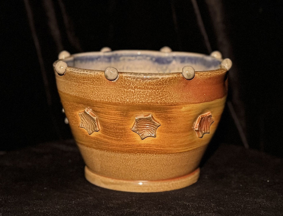 This bowl is soda fired with flashing on the outside, along with an orange strip in the middle than helps to enhance the patterned hexagons pushed in. Inside, the lavender glaze spills over the rim, just barely showing itself on the outside.The light dots are pushed into round divots, creating a pattern that can be seen from both sides. The size is 6.25”wide x 6.25” high.